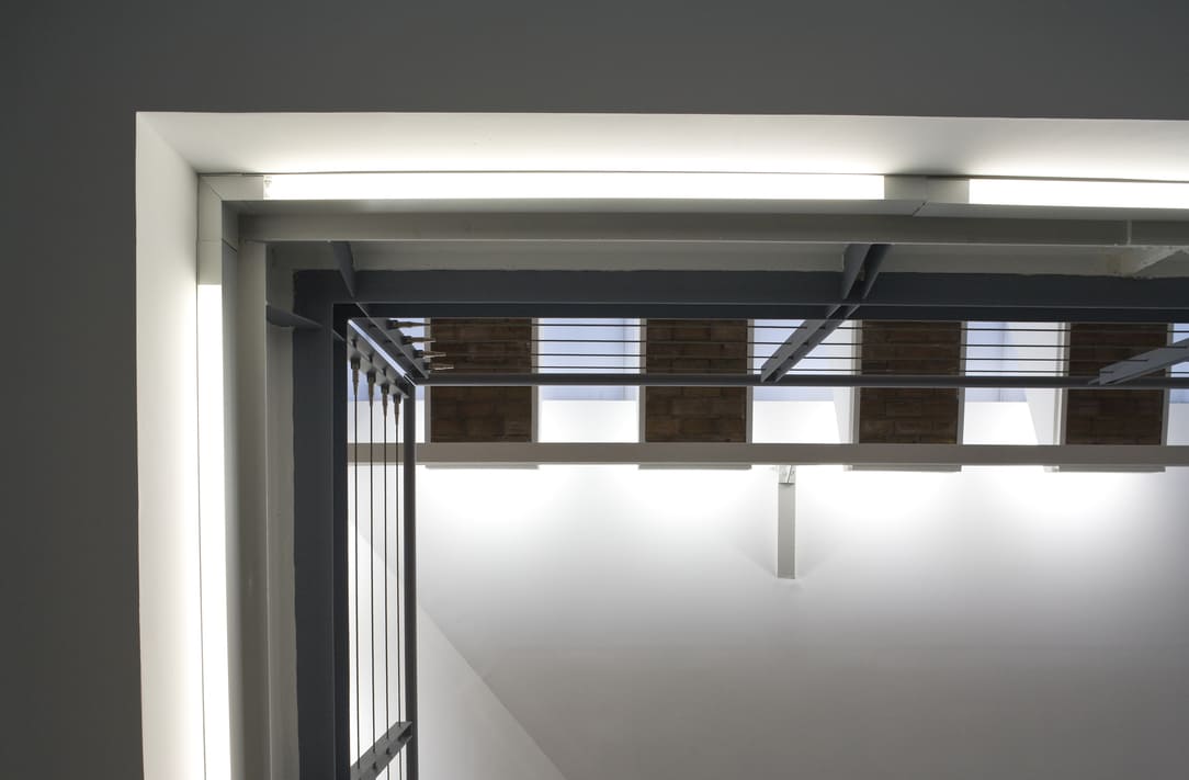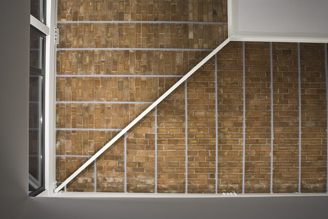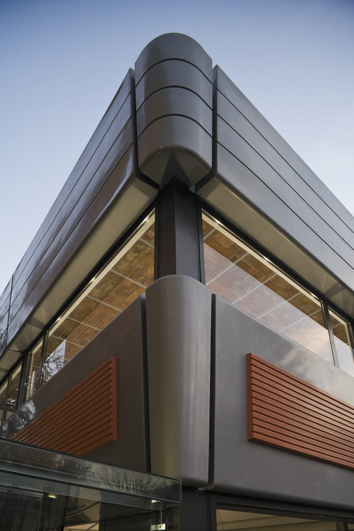 Las fachadas de poliéster reforzado con fibra de vidrio se inclinan desde la planta baja hasta alcanzar el antiguo alero, generando líneas de sombra a lo largo de todo su recorrido que no se interrumpen en las esquinas curvadas del rectángulo que conforma su planta.